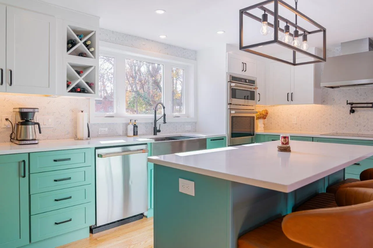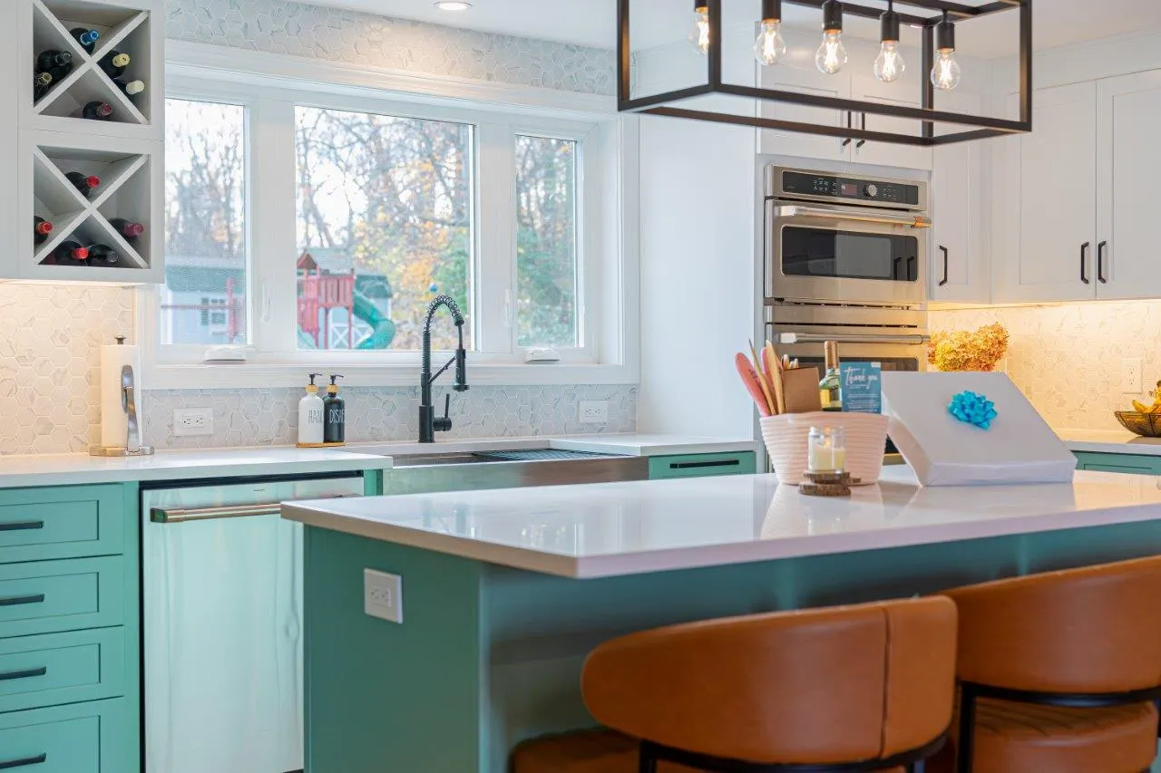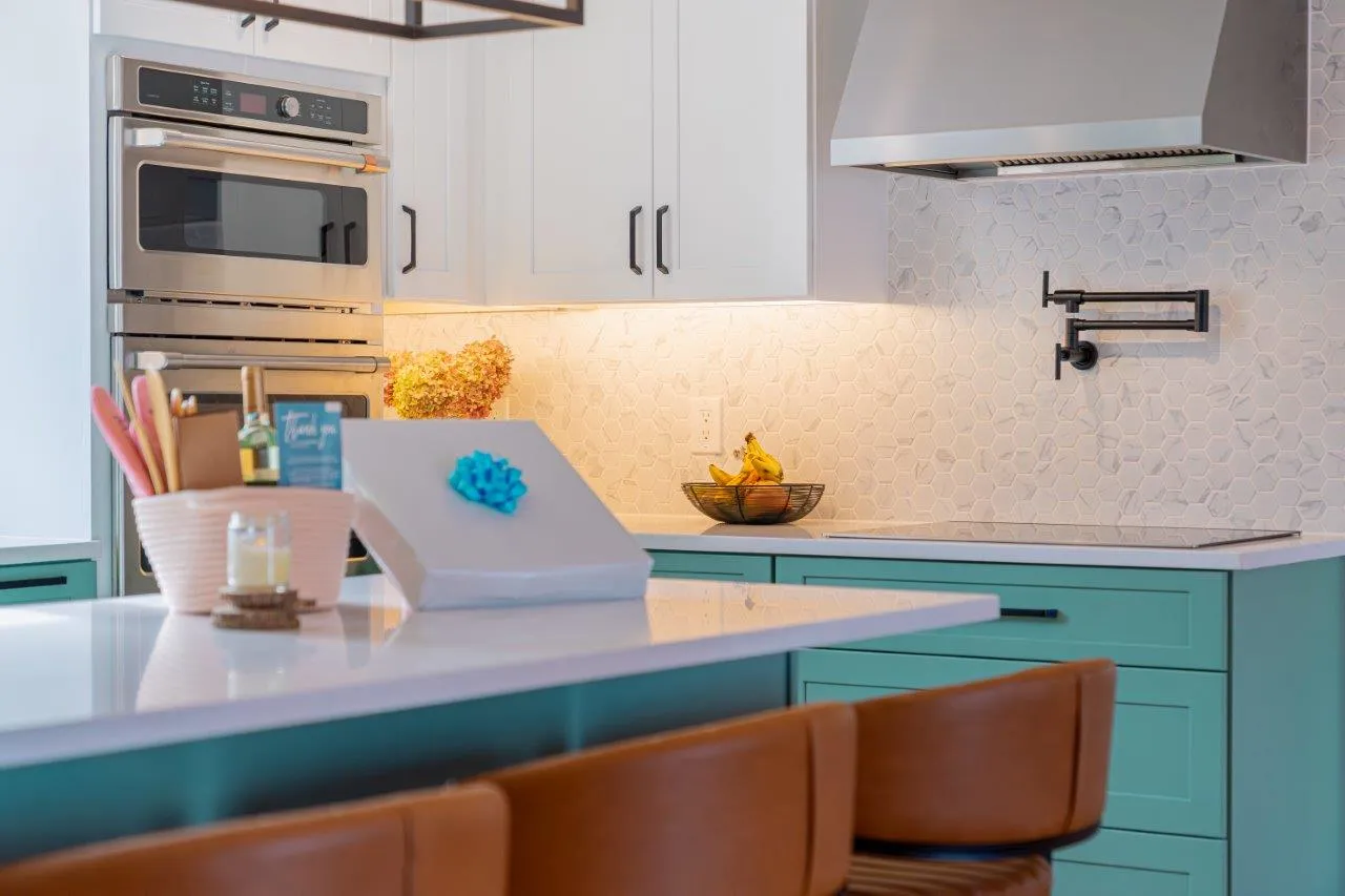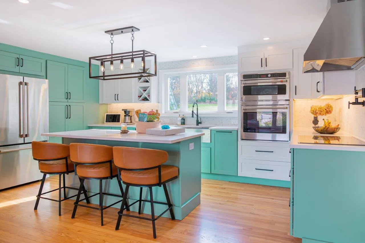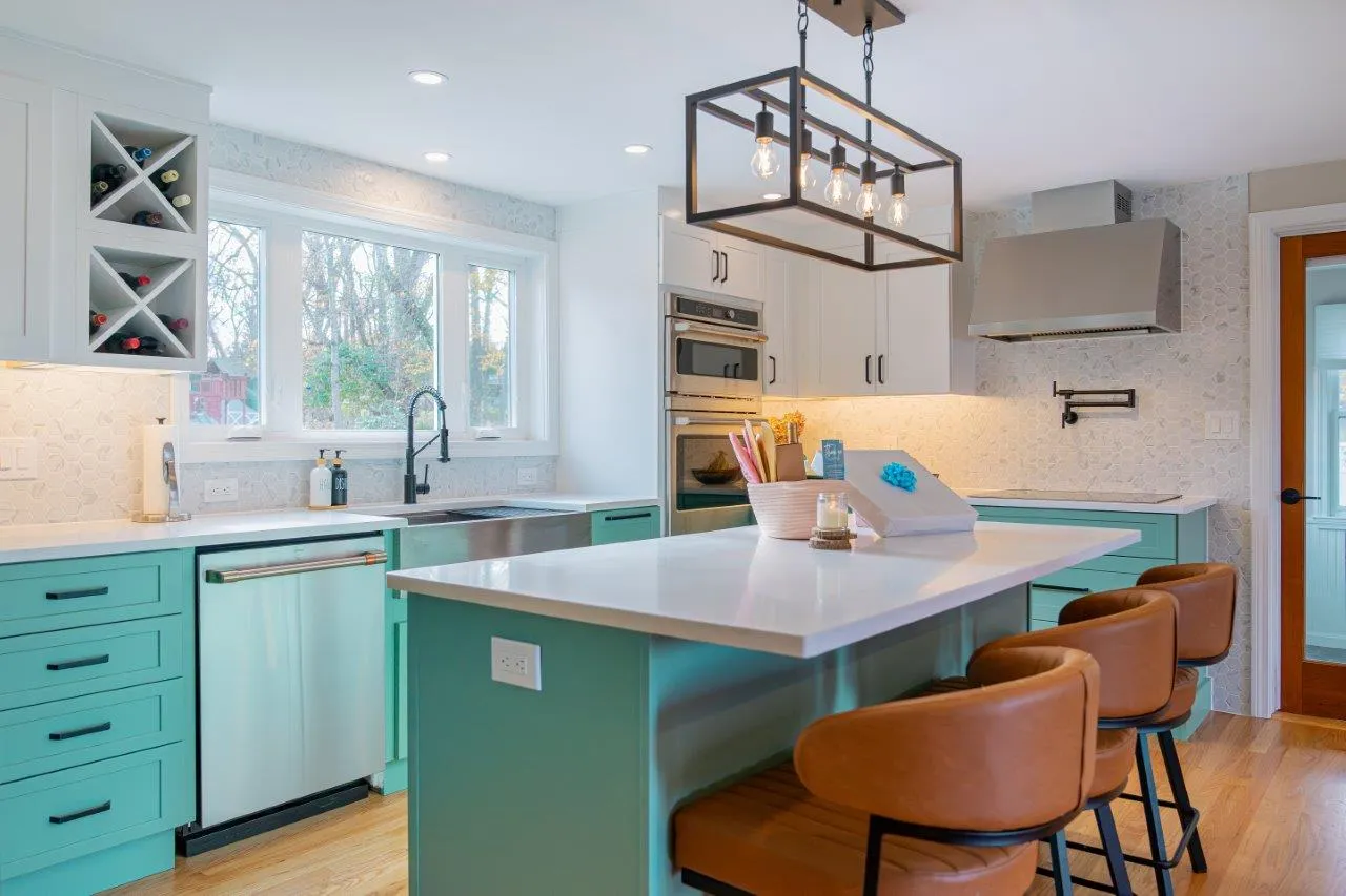The cabinetry features a fun two-color combination of turquoise and white, adding personality without sacrificing a clean, timeless look. We upgraded to high-quality appliances, refinished all the floors for a seamless finish, and optimized the lighting to keep the space bright from morning to evening.