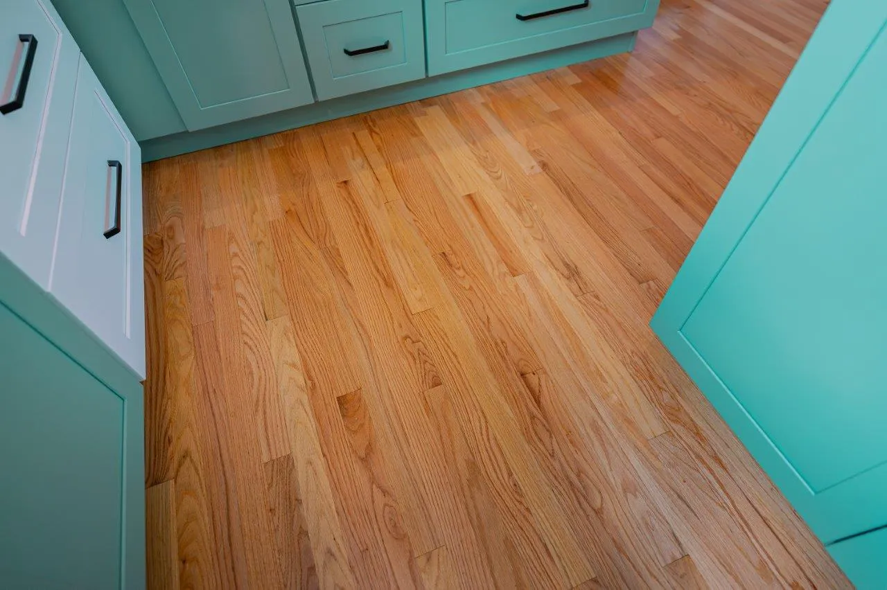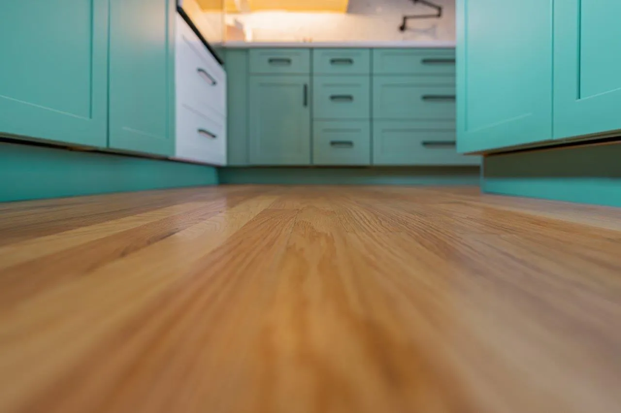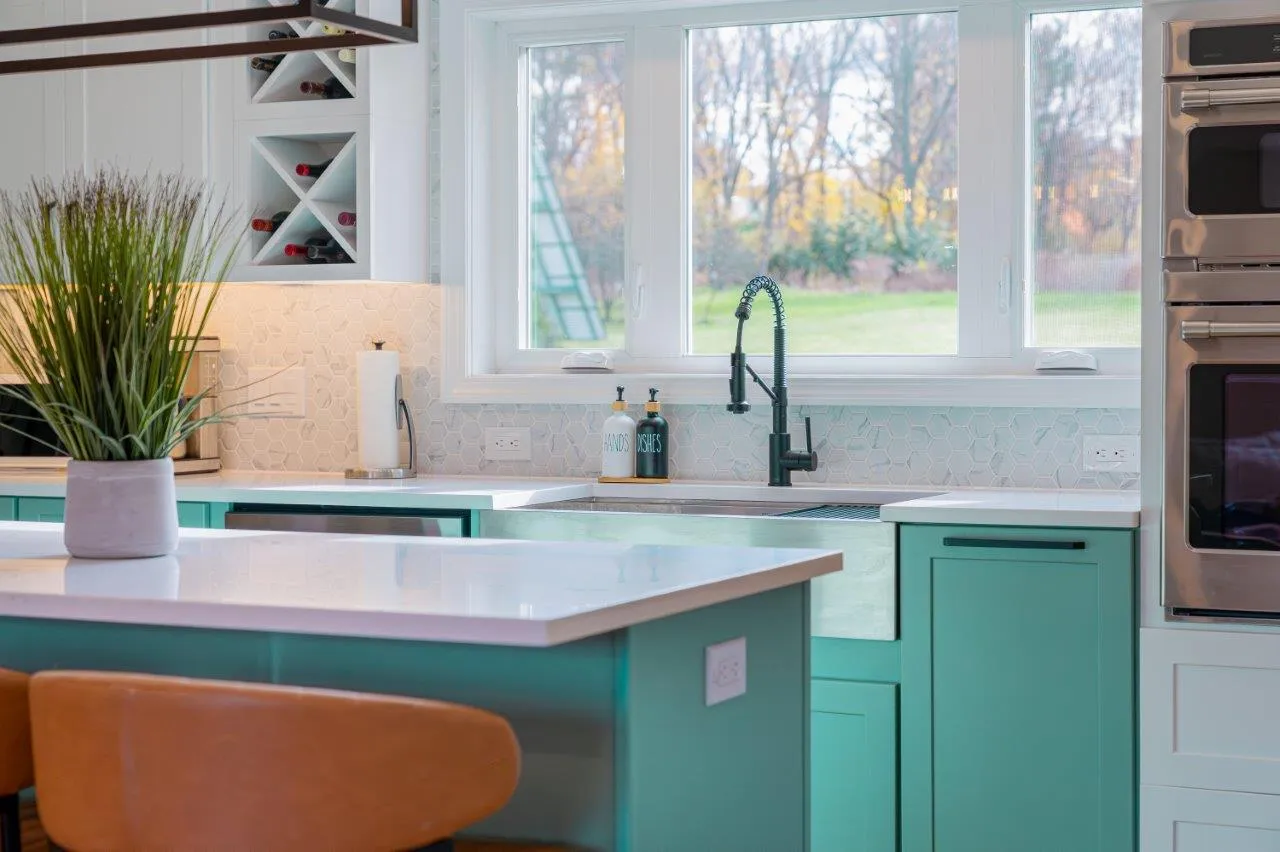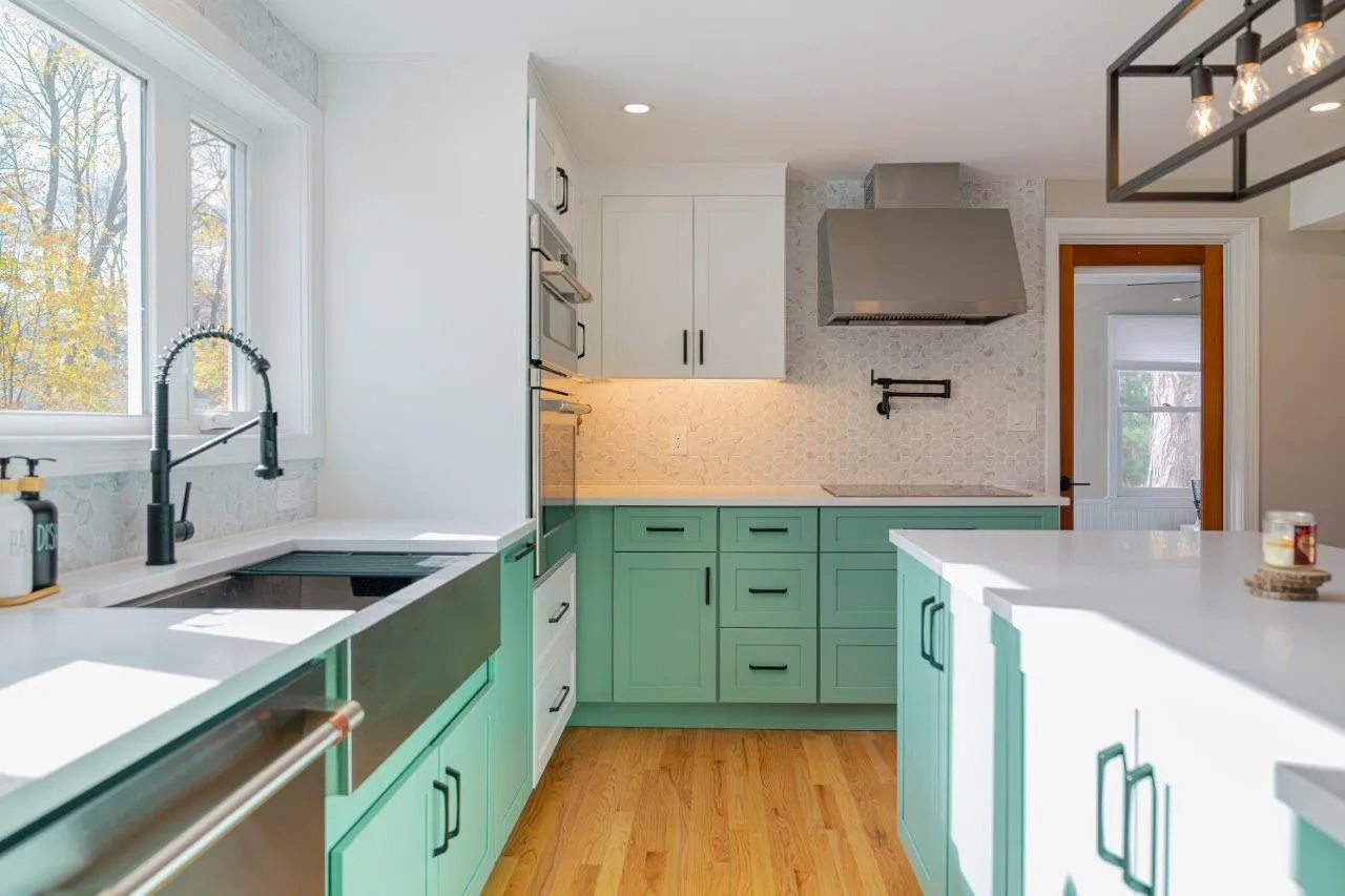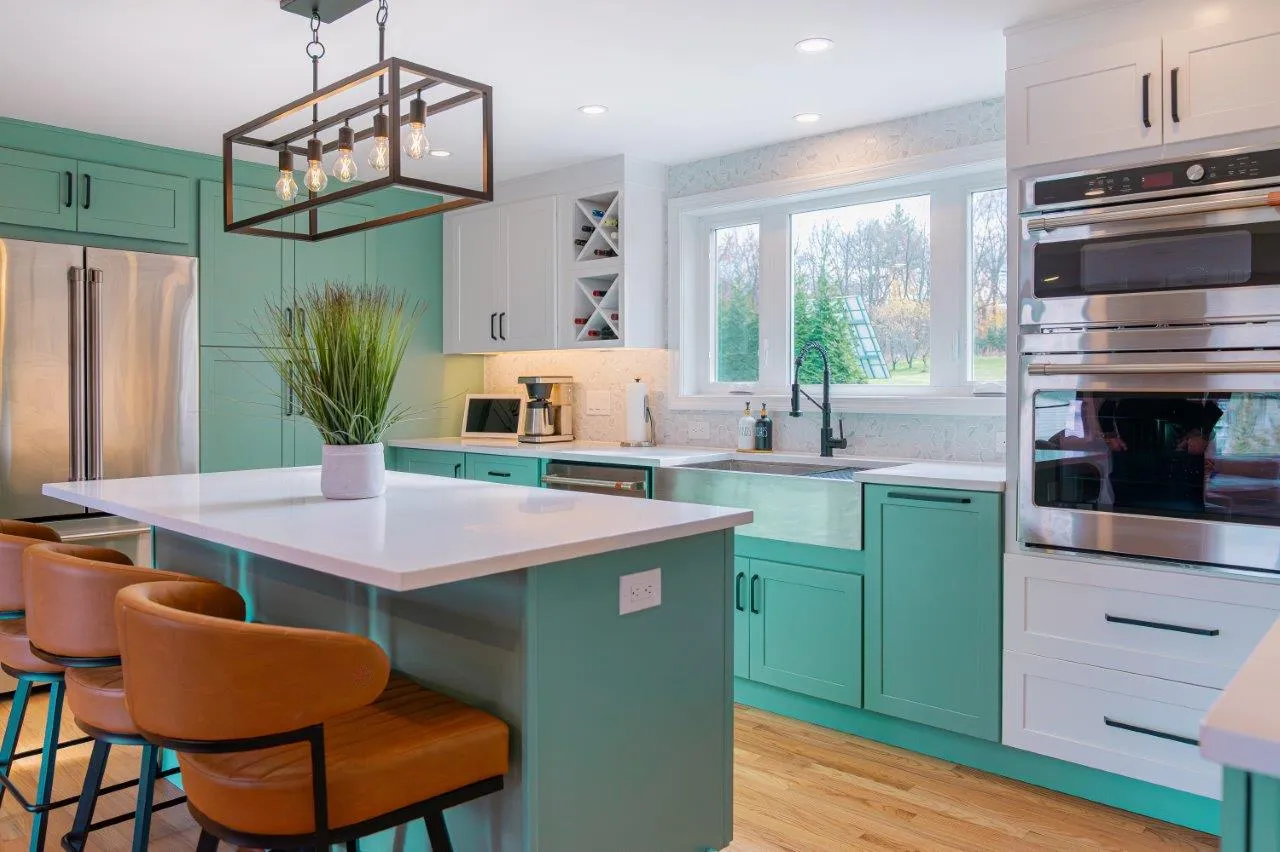 The cabinetry features a fun two-color combination of turquoise and white, adding personality without sacrificing a clean, timeless look. We upgraded to high-quality appliances, refinished all the floors for a seamless finish, and optimized the lighting to keep the space bright from morning to evening.