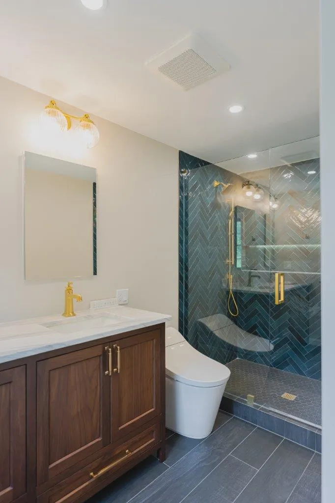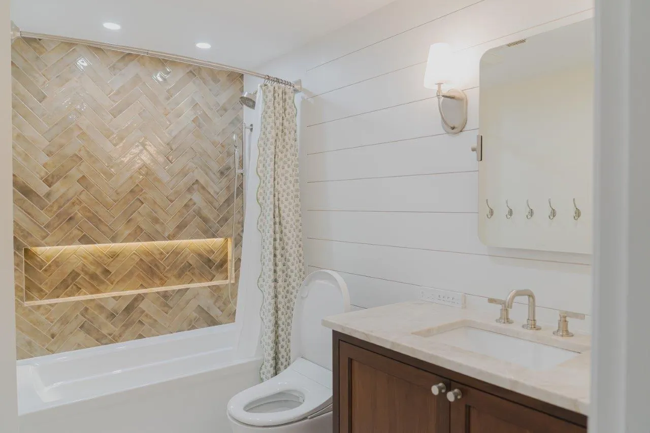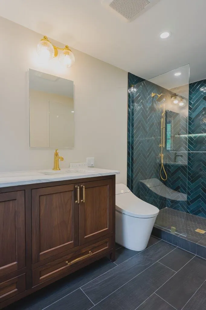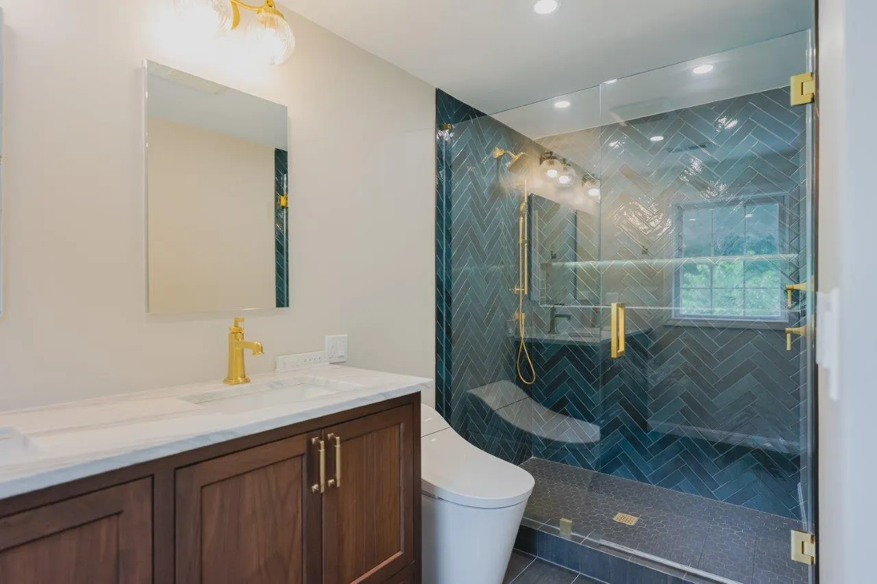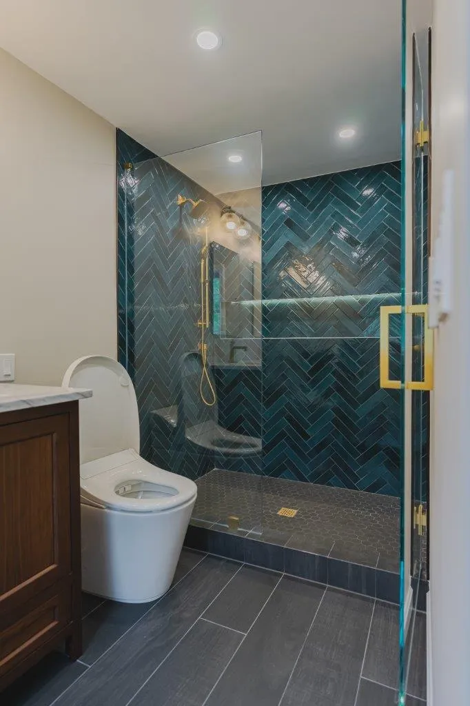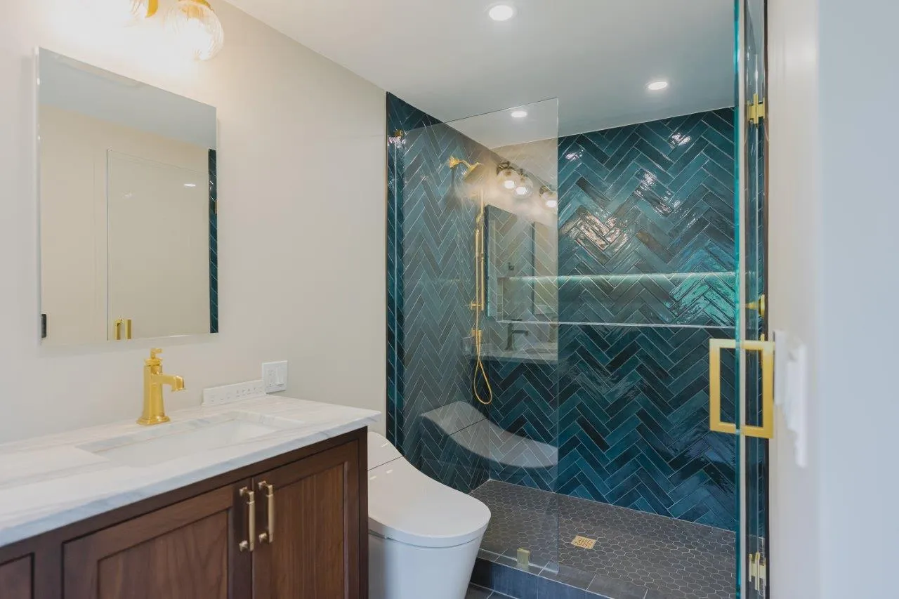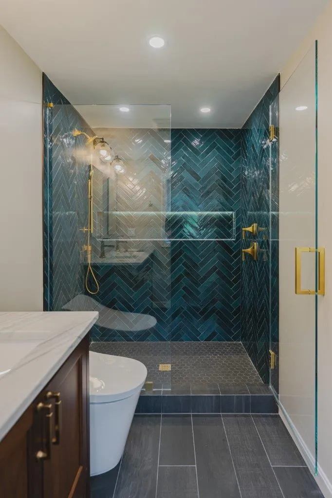 The couple’s bathroom received the biggest transformation. We expanded the shower area, added heated floors, and built custom niches with a striking herringbone pattern in soft green coastal tones. A double vanity with recessed medicine cabinets keeps the space organized and polished, while champagne bronze fixtures bring a warm, elegant finish. The centerpiece is the Ferrari of toilets, chosen for comfort and premium performance.