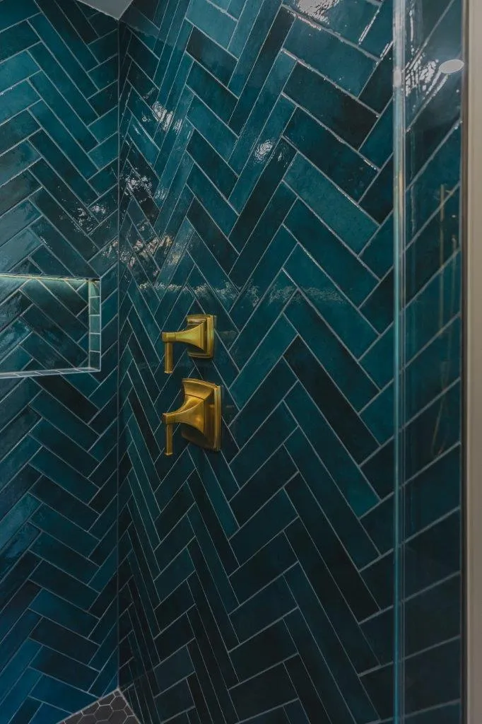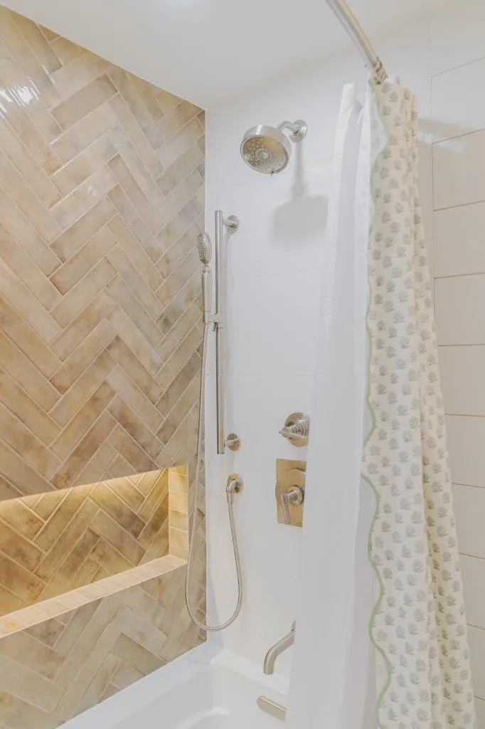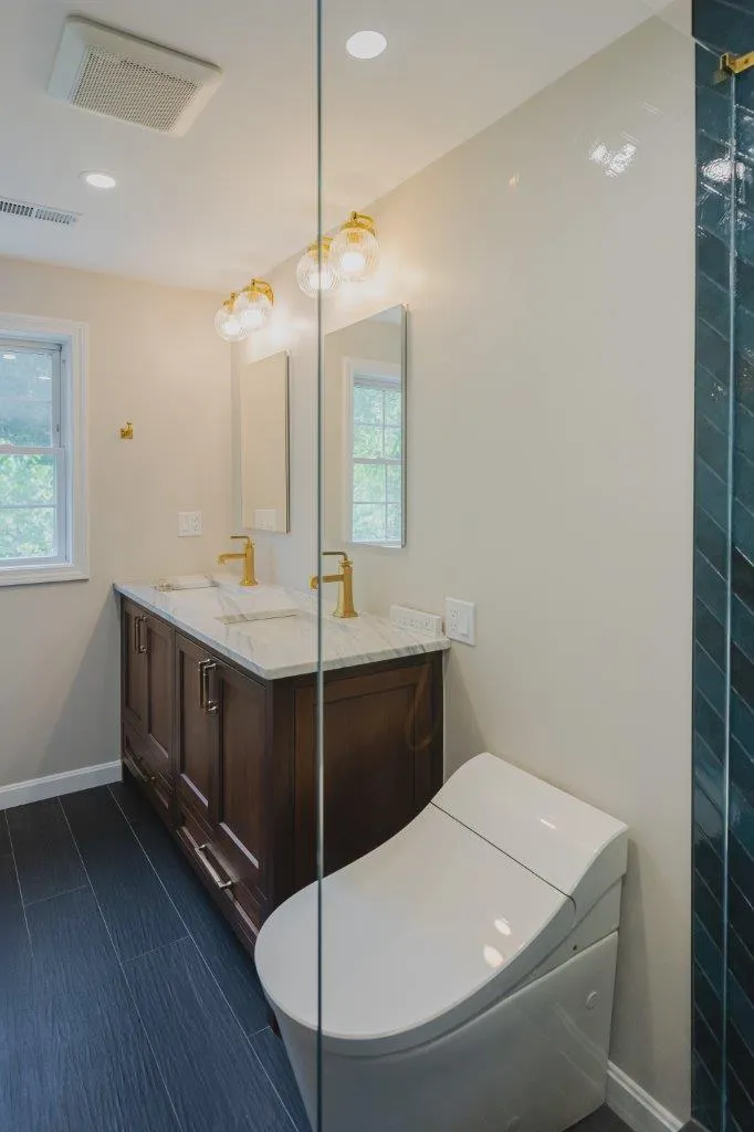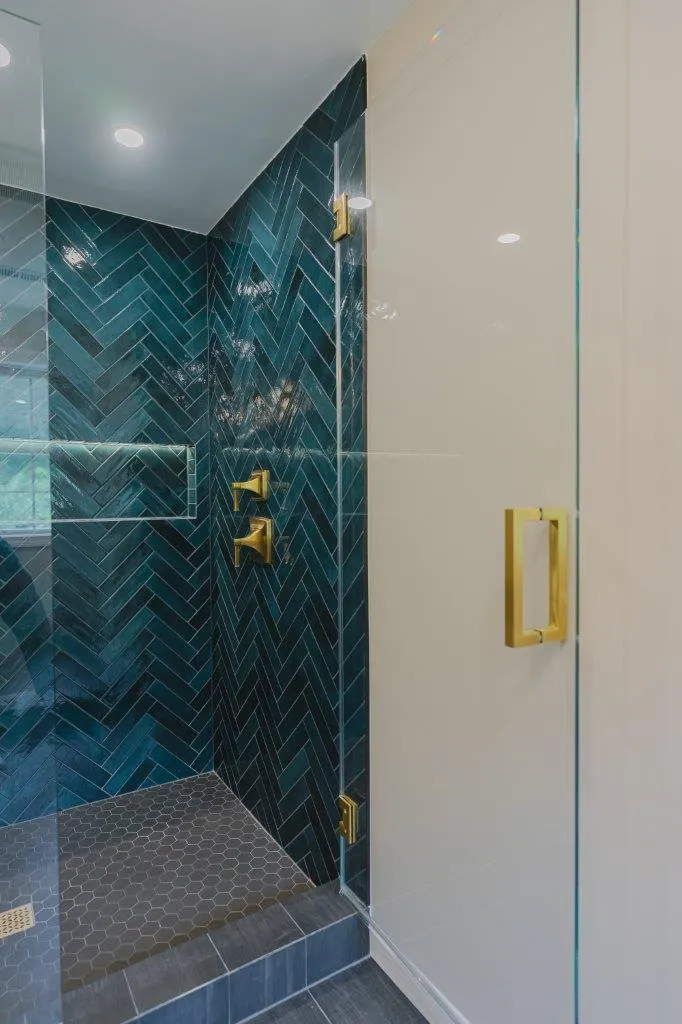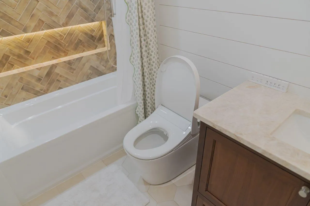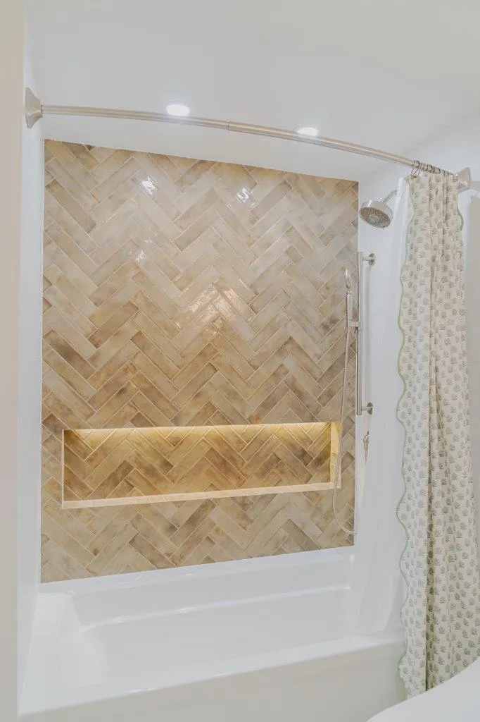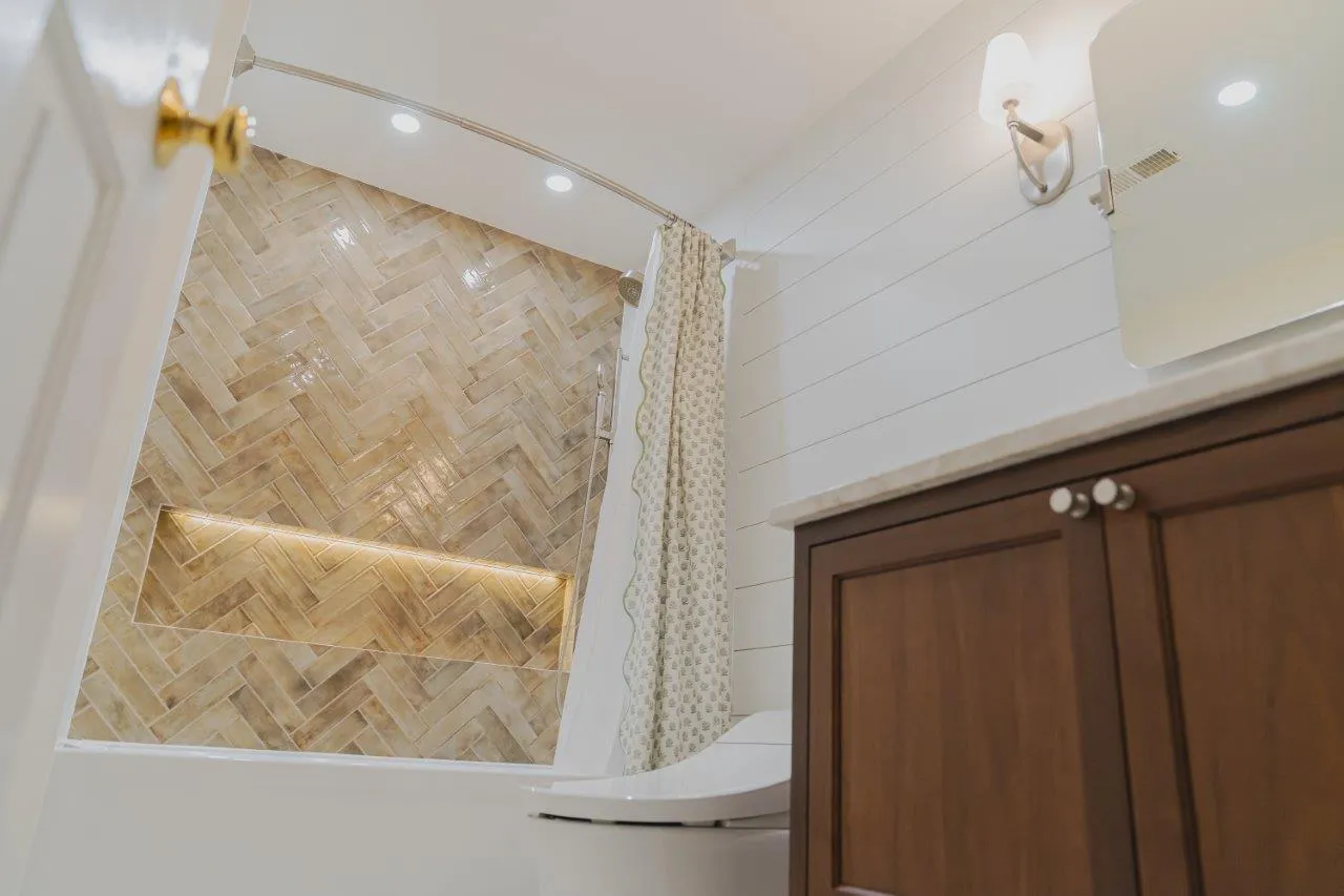 The couple’s bathroom received the biggest transformation. We expanded the shower area, added heated floors, and built custom niches with a striking herringbone pattern in soft green coastal tones. A double vanity with recessed medicine cabinets keeps the space organized and polished, while champagne bronze fixtures bring a warm, elegant finish. The centerpiece is the Ferrari of toilets, chosen for comfort and premium performance.
