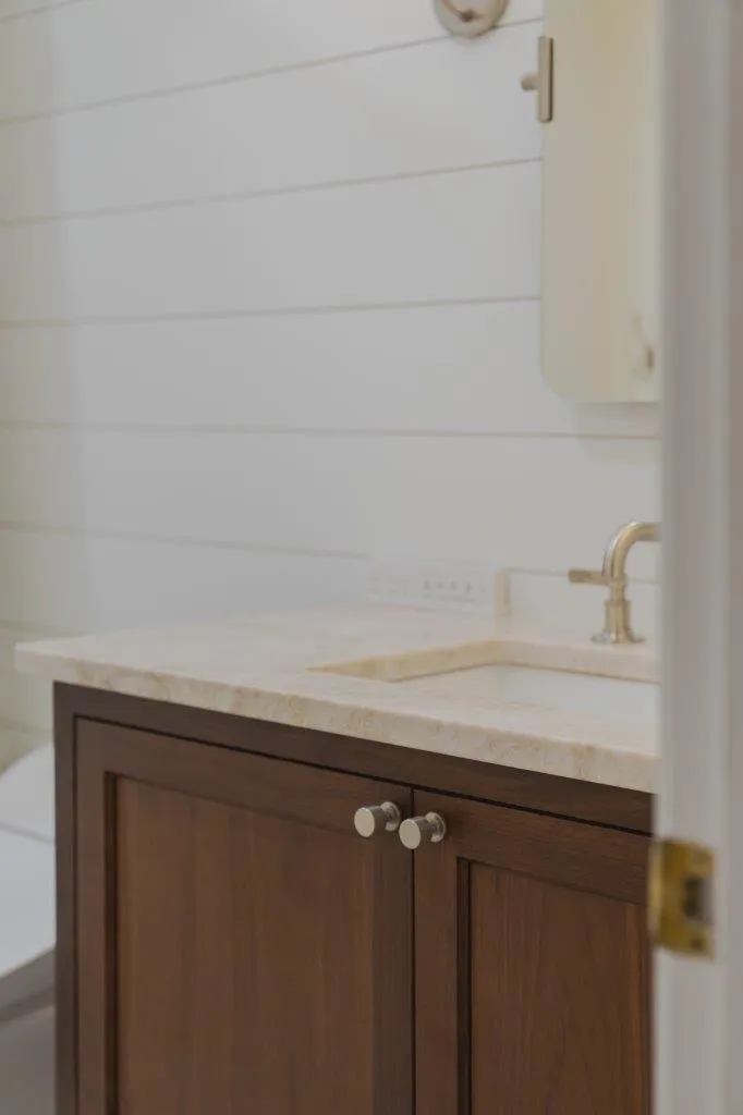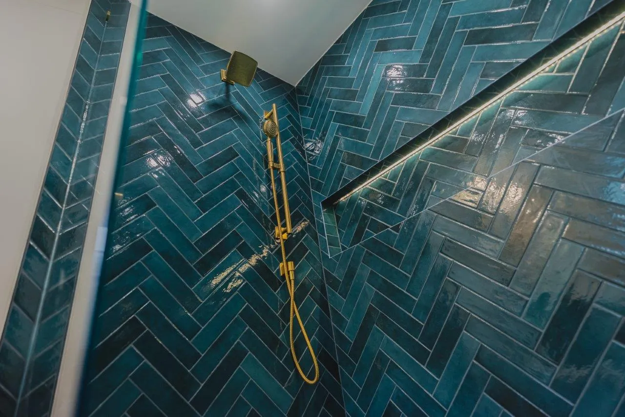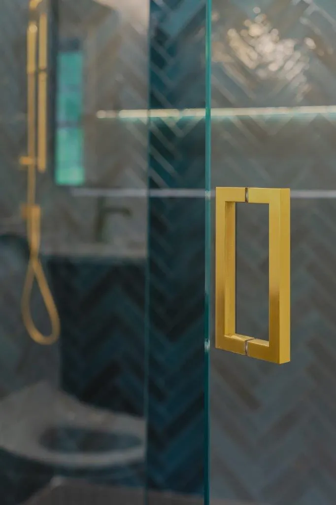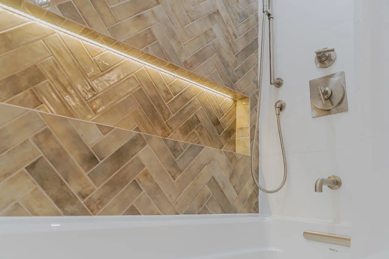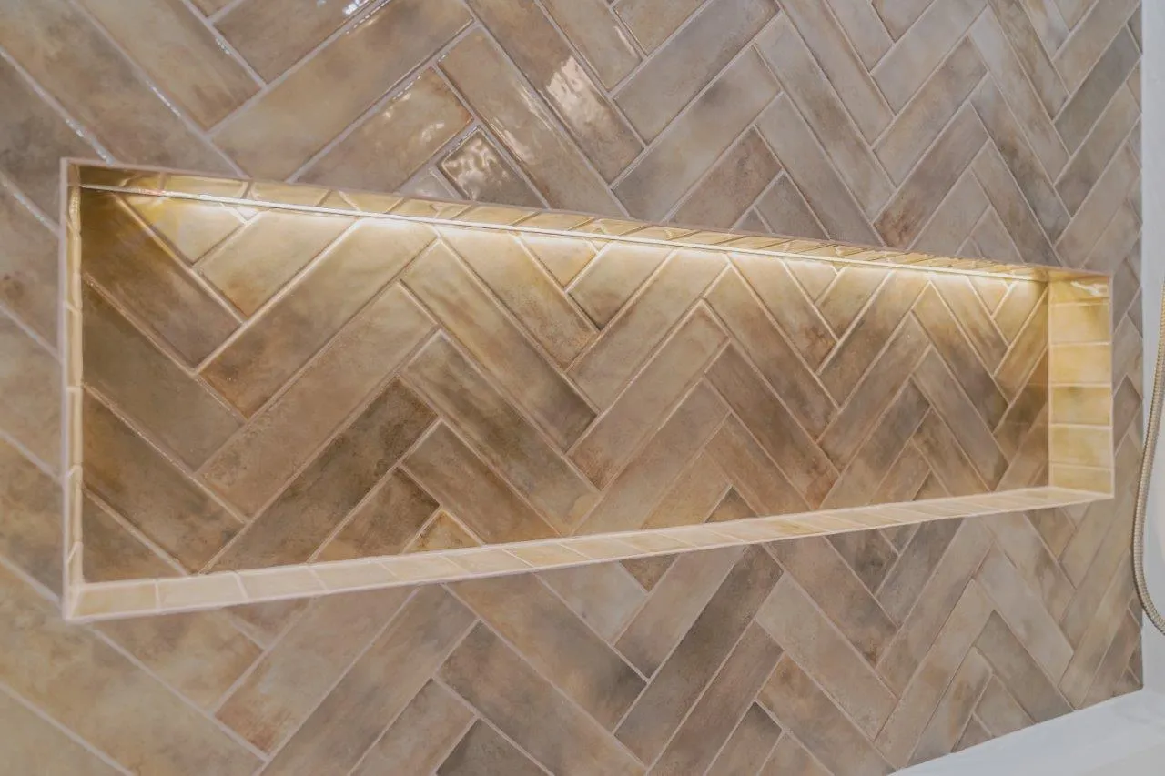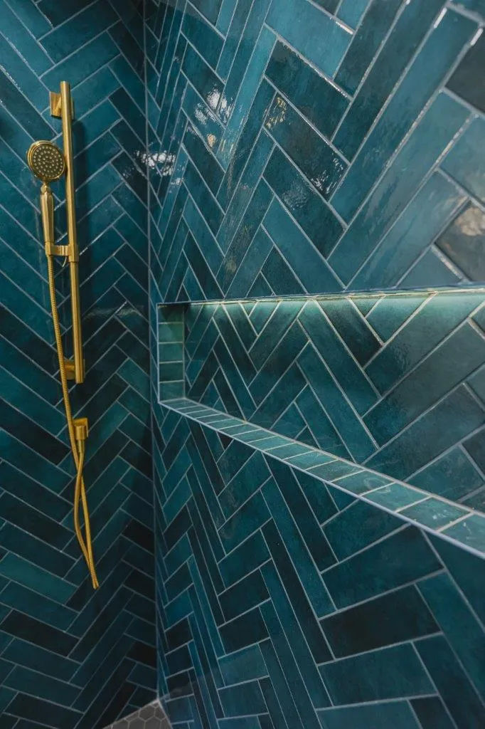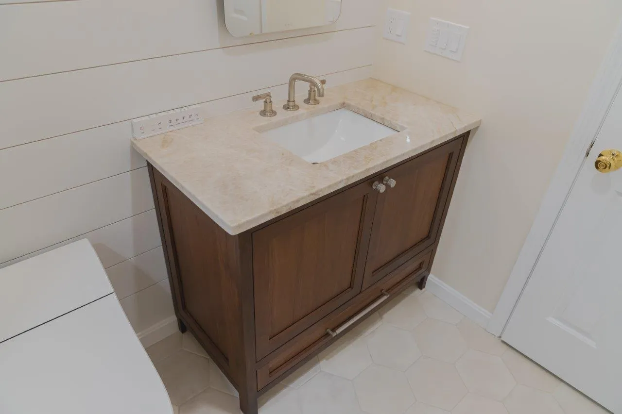 The couple’s bathroom received the biggest transformation. We expanded the shower area, added heated floors, and built custom niches with a striking herringbone pattern in soft green coastal tones. A double vanity with recessed medicine cabinets keeps the space organized and polished, while champagne bronze fixtures bring a warm, elegant finish. The centerpiece is the Ferrari of toilets, chosen for comfort and premium performance.