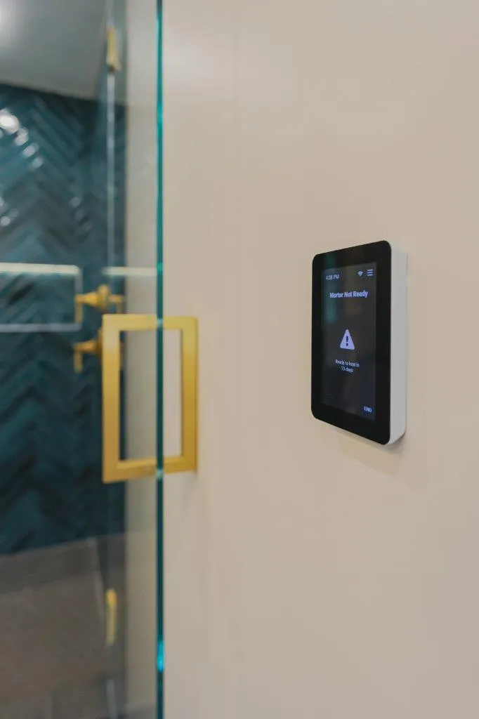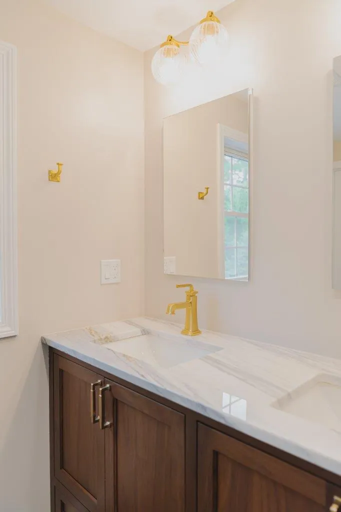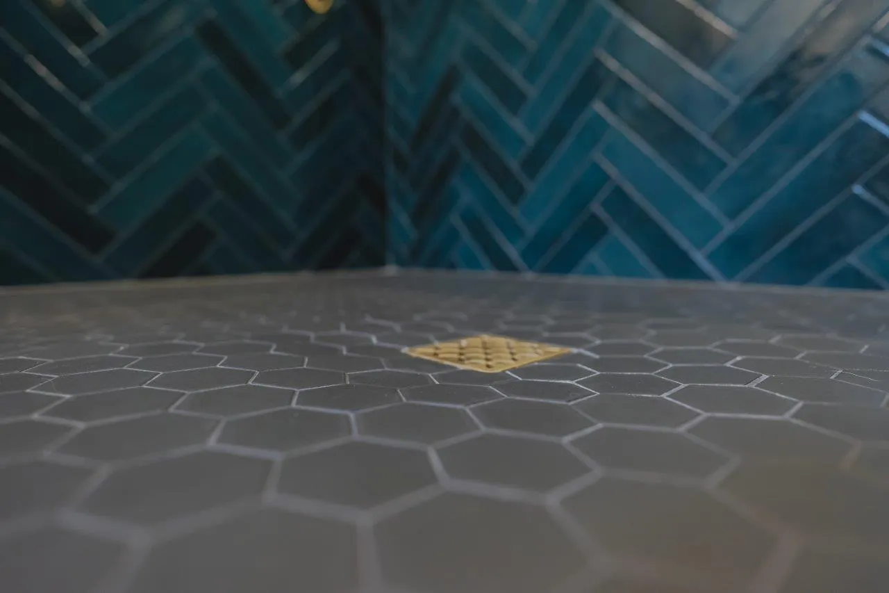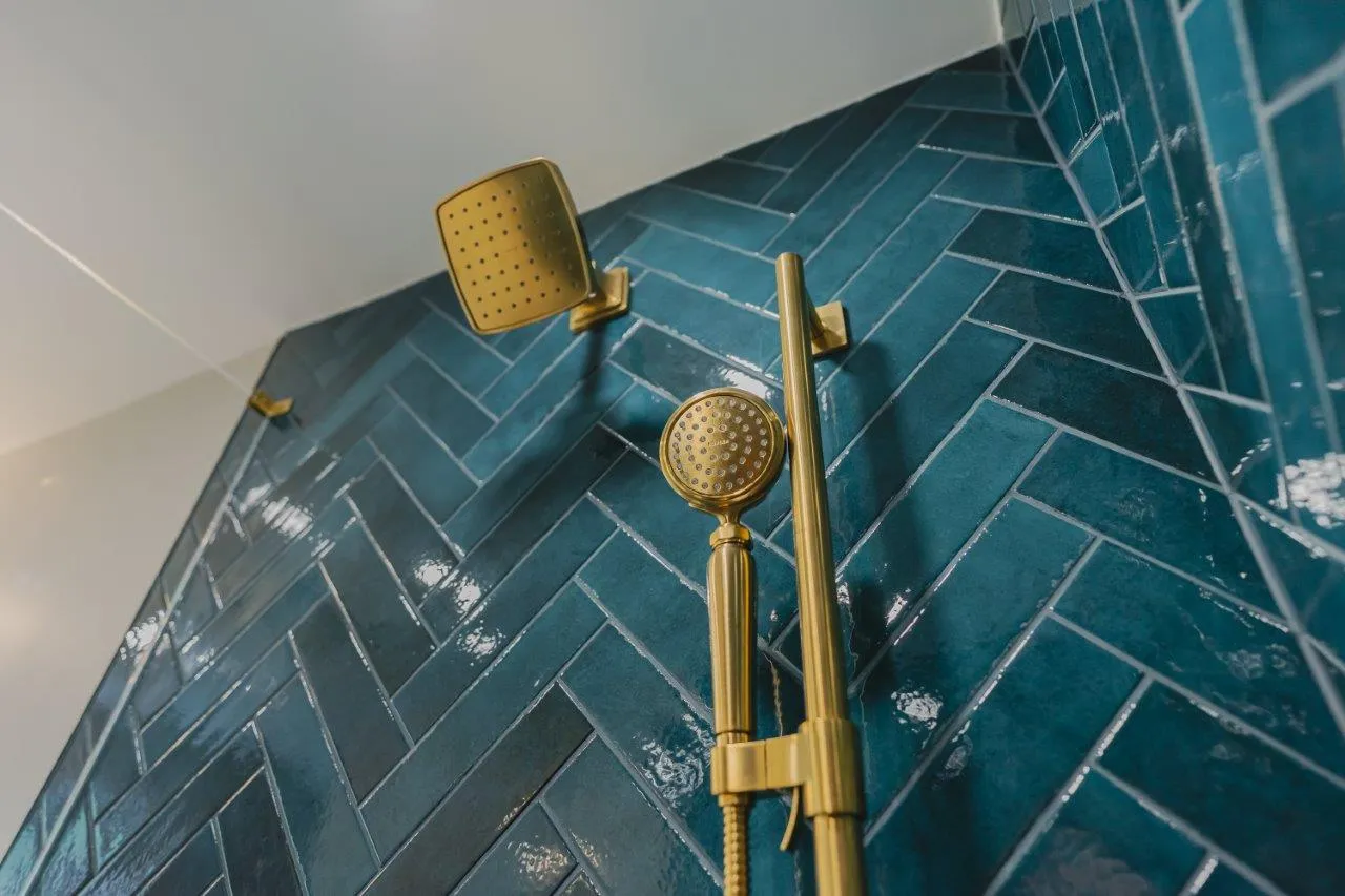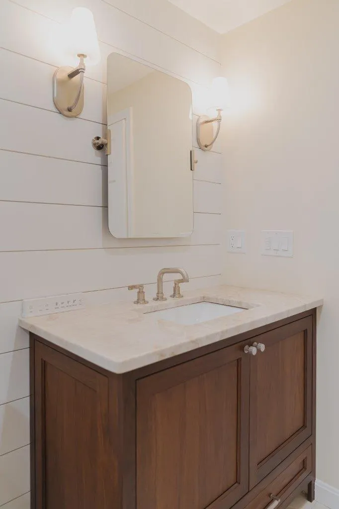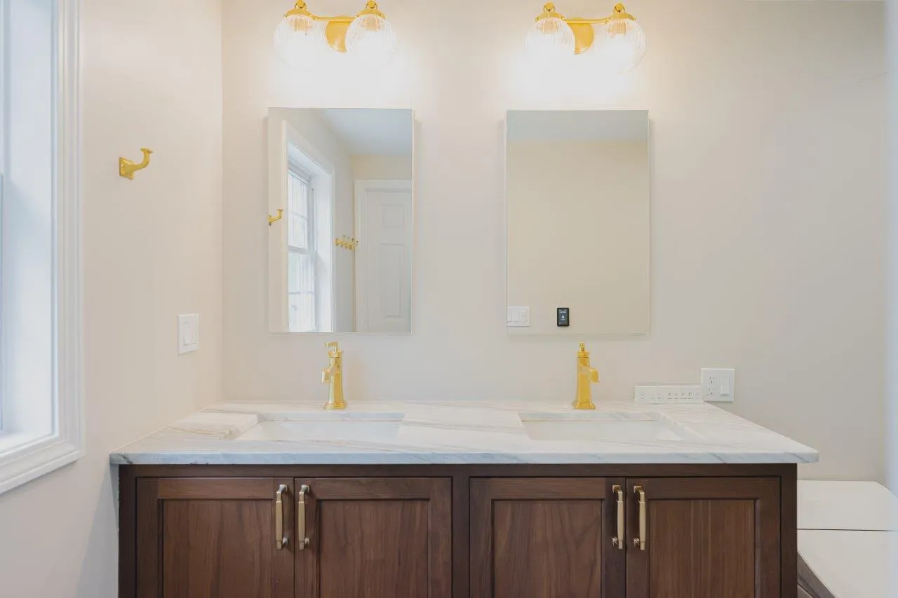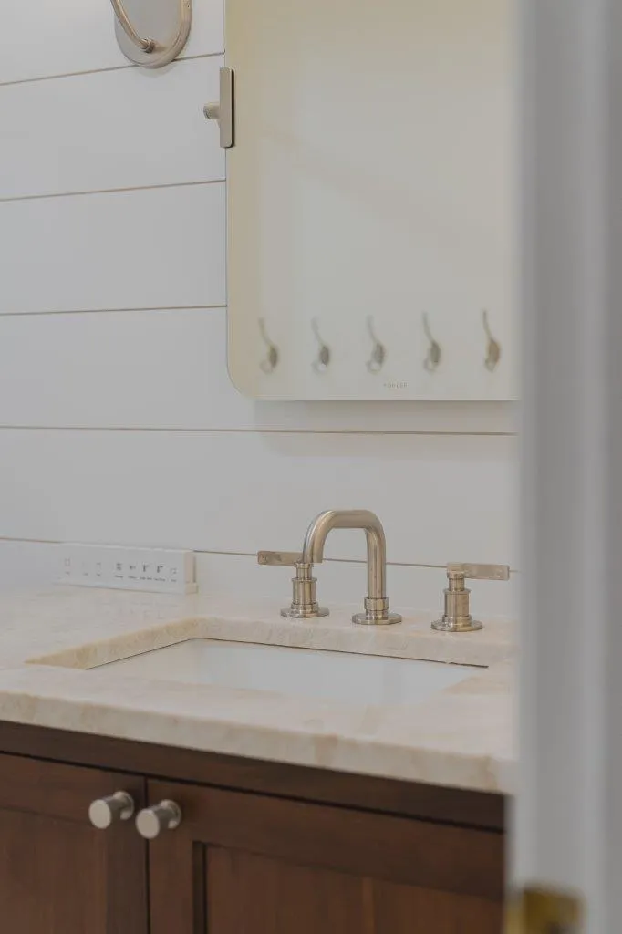 The couple’s bathroom received the biggest transformation. We expanded the shower area, added heated floors, and built custom niches with a striking herringbone pattern in soft green coastal tones. A double vanity with recessed medicine cabinets keeps the space organized and polished, while champagne bronze fixtures bring a warm, elegant finish. The centerpiece is the Ferrari of toilets, chosen for comfort and premium performance.