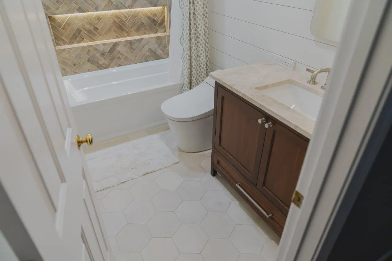 The kids bathroom was designed to feel bright, clean, and easy to use every day. We replaced the old tub with a new layout that offers more room, updated the linen closet for better storage, and installed the same high quality toilet from the primary suite. White tones, new tile work, and LED lighting keep the space fresh and timeless.